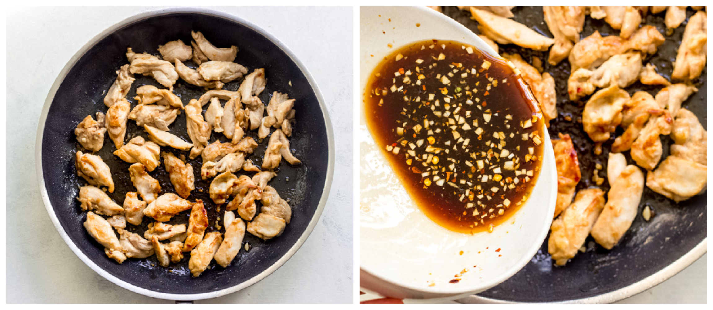 - Heat avocado oil in a large skillet (at least 12-inch or bigger) over medium-high heat. With a pair of tongs, remove the chicken from the marinade and add to the pan, discarding the leftover marinade. Cook 3-4 minutes, or until barely cooked through, while stirring frequently.