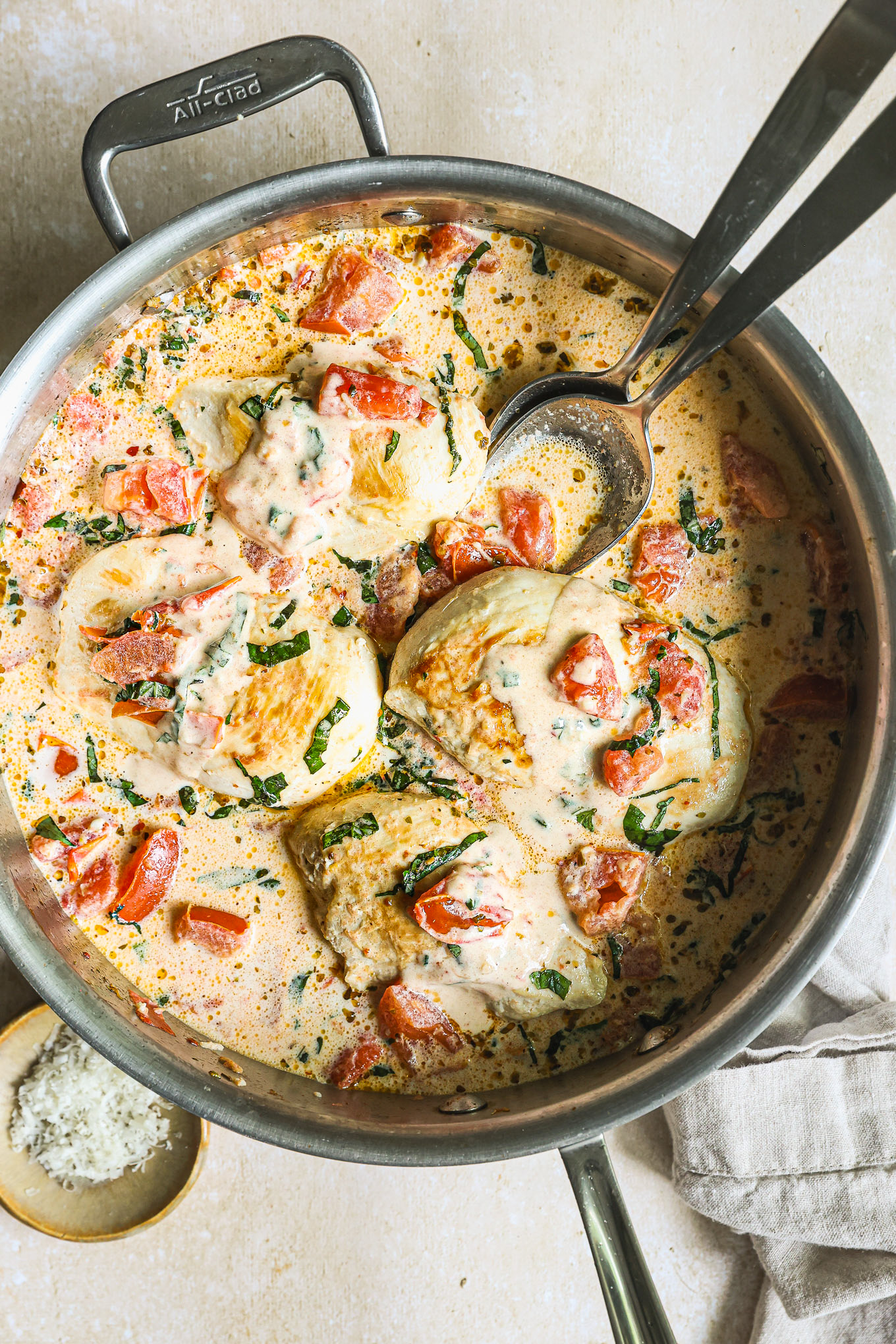 Return chicken to the pan and simmer with sauce, partially covered, for about 1-2 minutes or until sauce slightly thickens. Stir in Parmesan cheese and basil. Serve with pasta, rice, or crusty bread to soak up the delicious sauce.