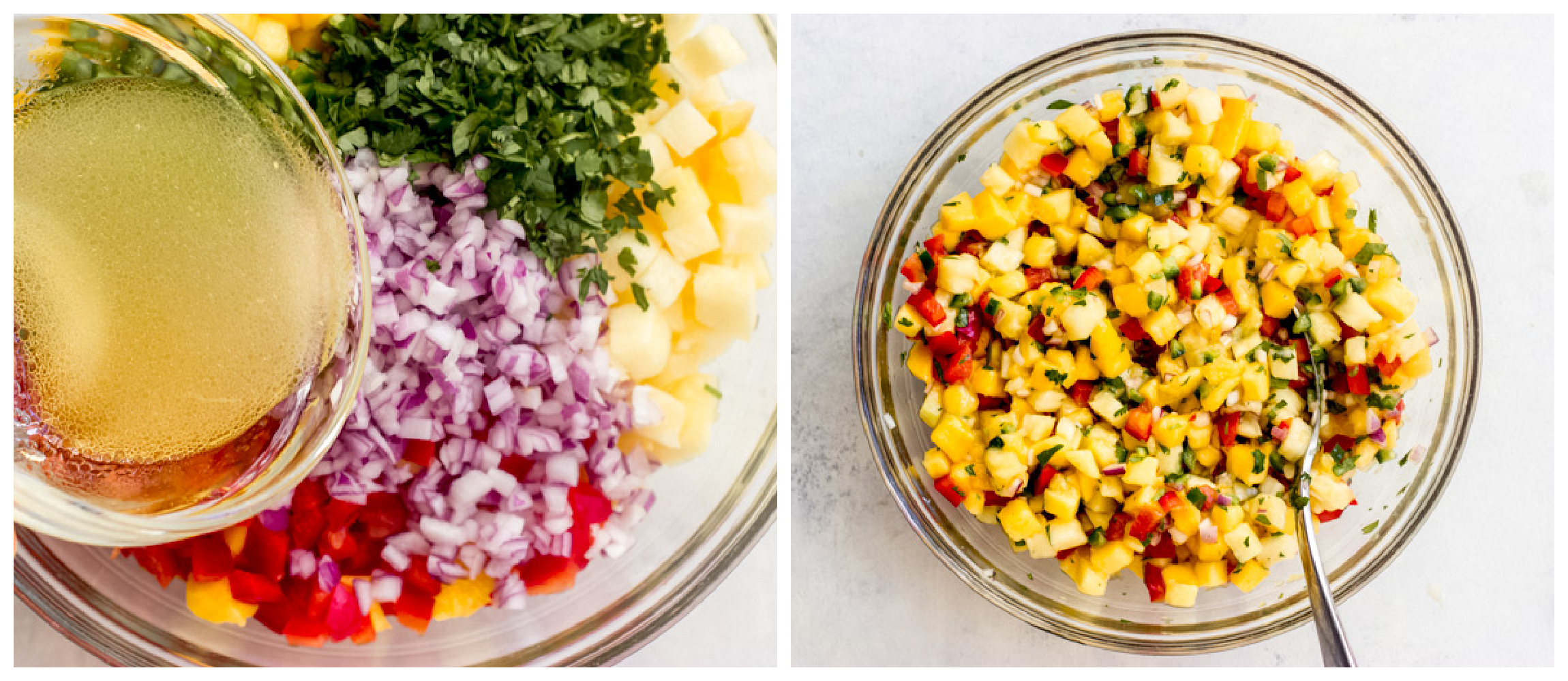 - In a large bowl, combine together the pineapple, mangoes, bell pepper, jalapeno, onion, and cilantro.